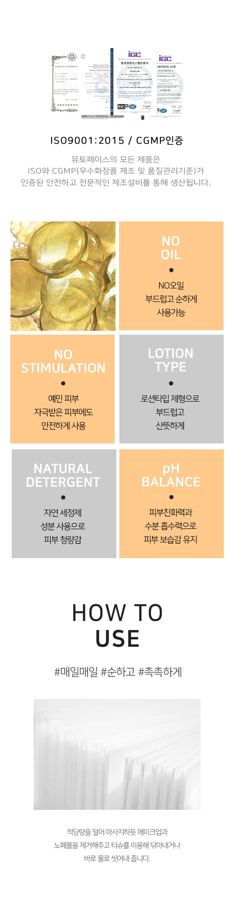 1. 건조한 손에 2펌프 (3g)를 얼굴에 바릅니다. 2. 얼굴전체를 부드럽게 마사지 하여 메이크업 및 유분을 지워줍니다. 3. 스폰지 또는 티슈로 닦아냅니다. 4. 폼클린저로 마무리 합니다.